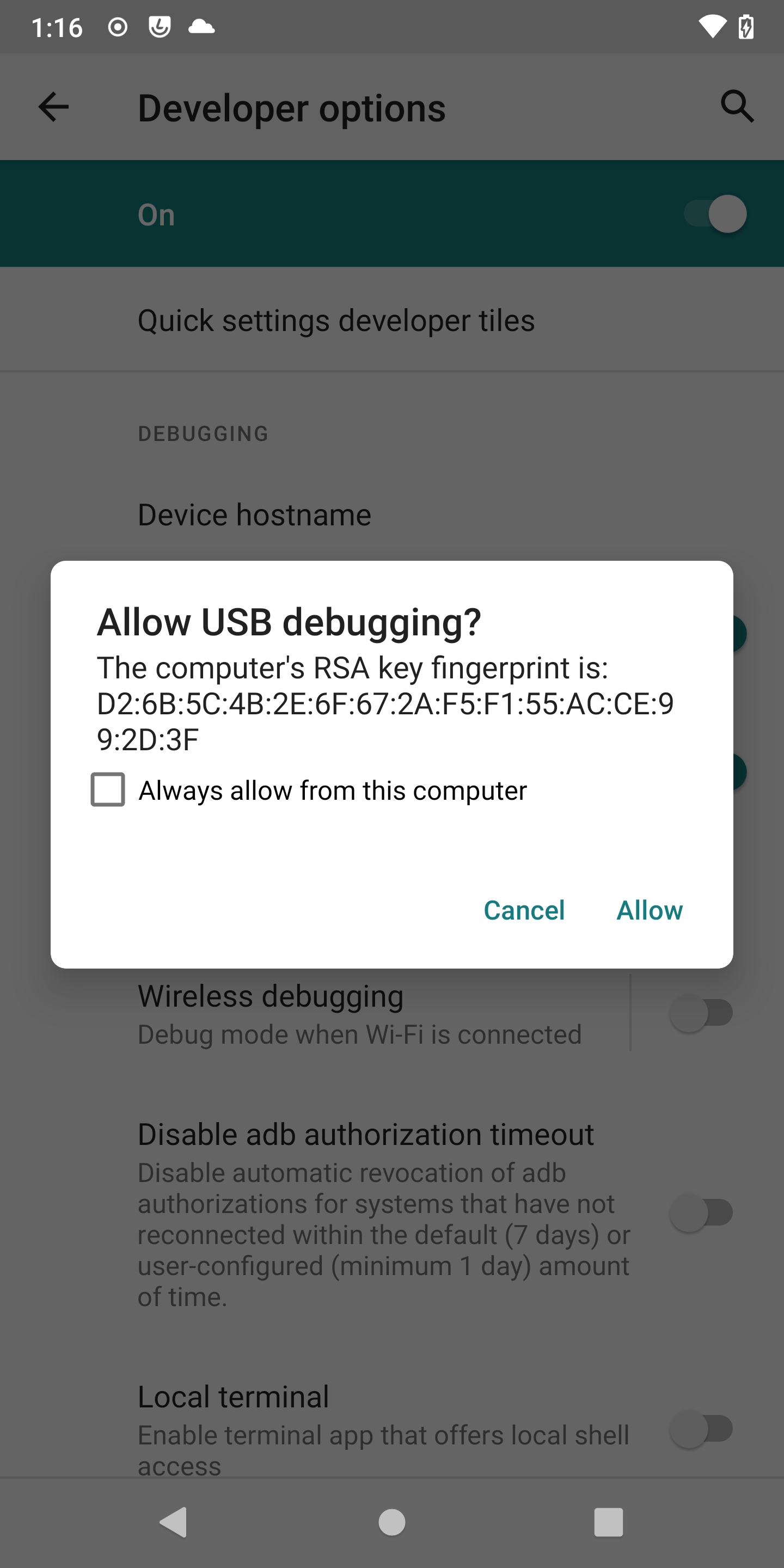 .\adb.exe attachfirst, and then you’ll get a prompt on your phone to allow the connection.