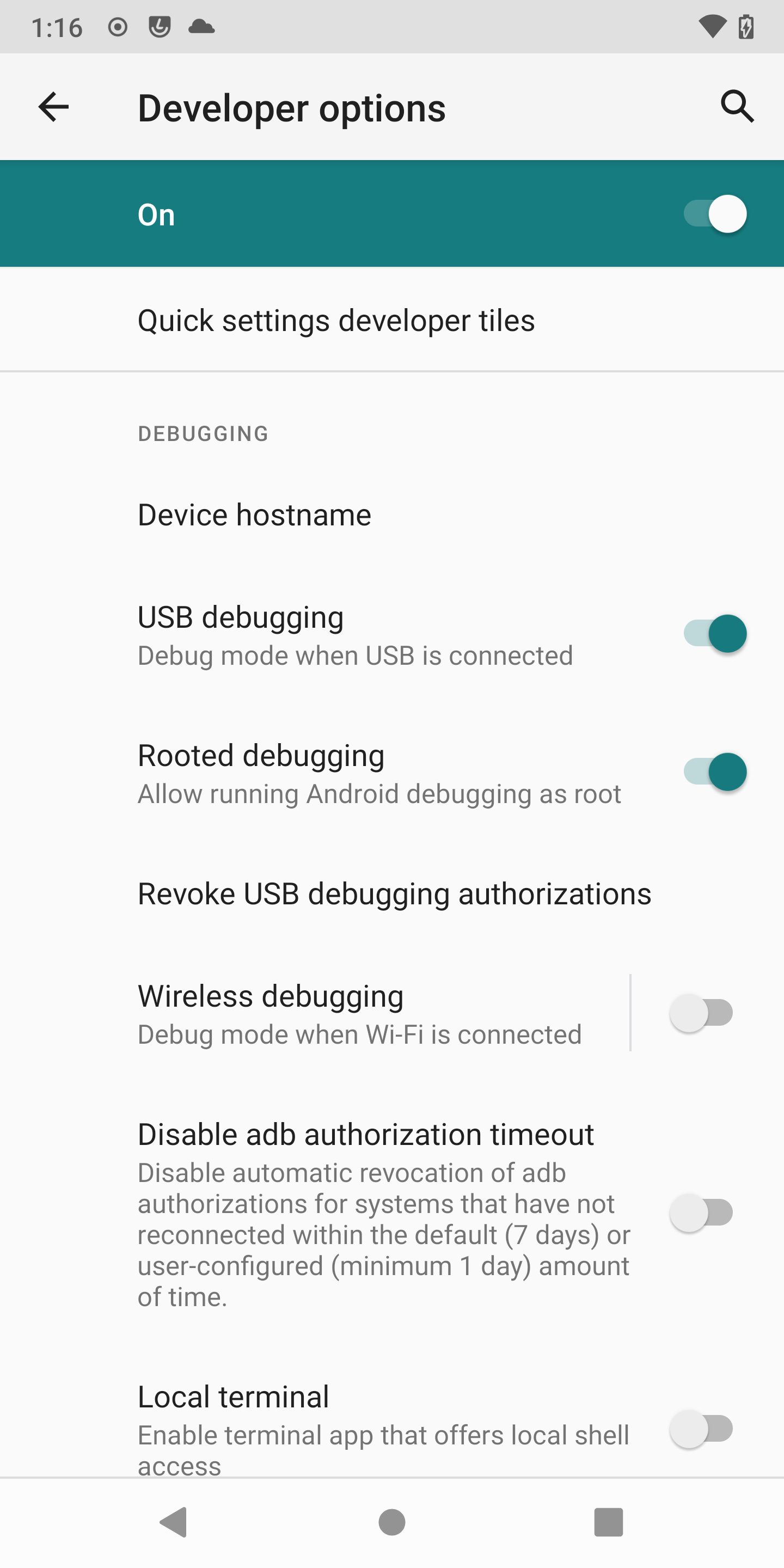 Now that you have your comics downloaded, you need to enable developer tools by tapping on Build number 7 times (Settings > About Phone > Build Number). From there, you can navigate to System > Developer options > Debugging where you need to enable USB debugging AND Rooted debugging.