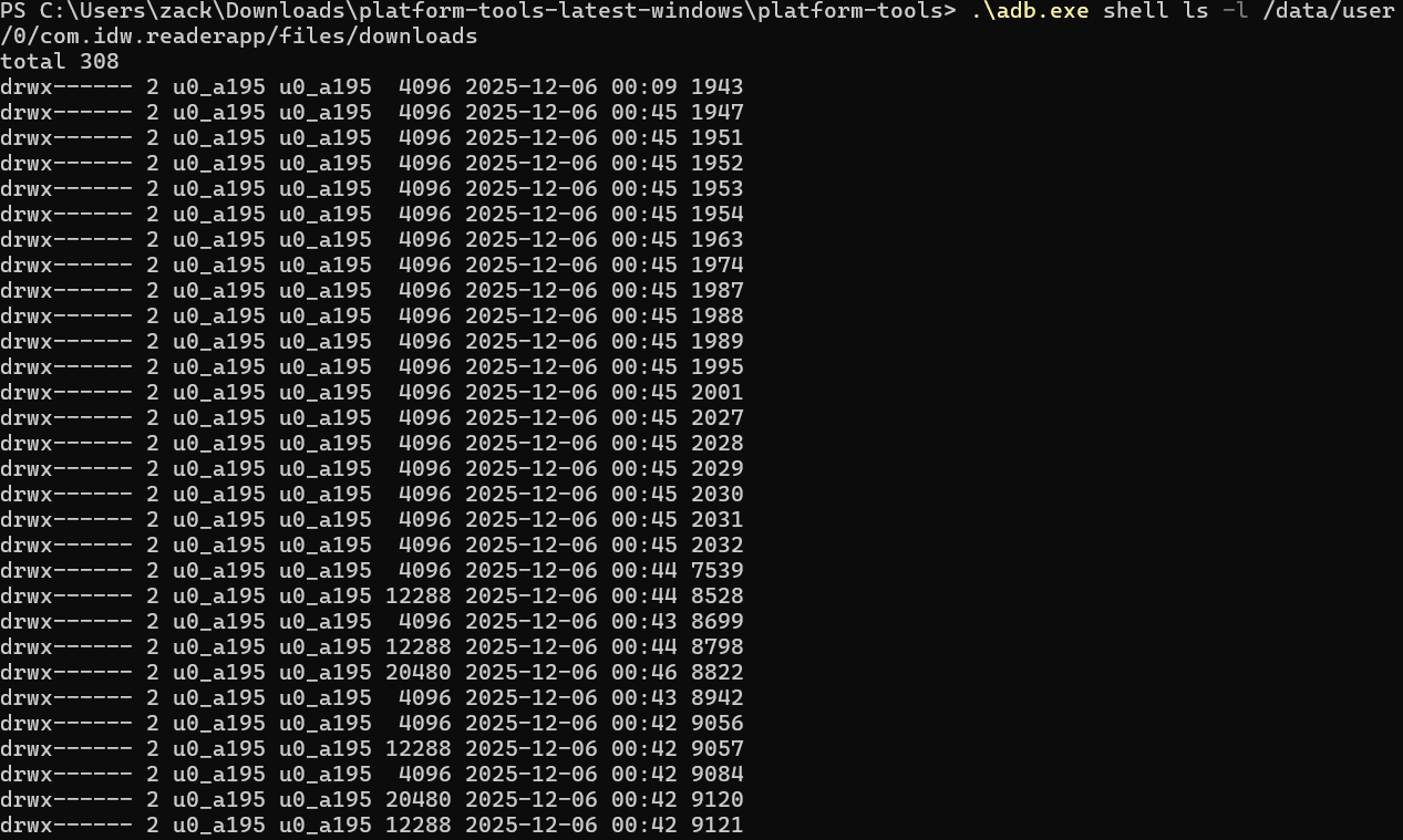 .\adb.exe shell ls -l /data/user/0/com.idw.readerapp/files/downloads. The path is obviously subject to change, but this is for the current app version at time of writing (6.4.0)You should see a list of folders with number names like below.