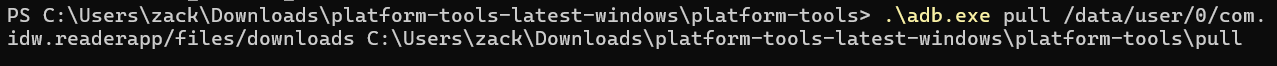 .\adb.exe pull /data/user/0/com.idw.readerapp/files/downloads <your folder here>. Make sure to use the full path and if there are any spaces, wrap it in quotes (""). An example:.\adb.exe pull /data/user/0/com.idw.readerapp/files/downloads C:\Users\zack\Downloads\idw